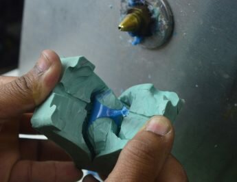 Um ourives produz a peça que será utilizada para fazer um molde de borracha. Essa borracha será vulcanizada para que endureça. A peça em metal é retirada e pode-se injetar a cera nesse molde. Como resultado teremos a peça idêntica em cera. Essa peça será reproduzida em diversas outras que serão então montadas na árvore para fundição.